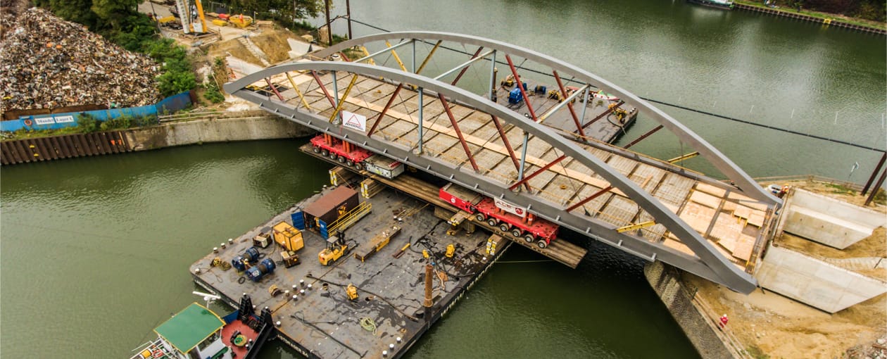 Einschub des 72 Meter langen Stahlbauwerks mittels einer Kombination aus Pontons, Kamags und Litzen
