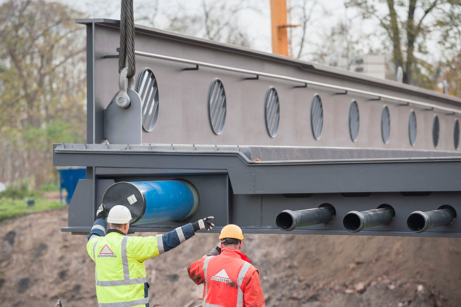 Einschub des 72 Meter langen Stahlbauwerks mittels einer Kombination aus Pontons, Kamags und Litzen